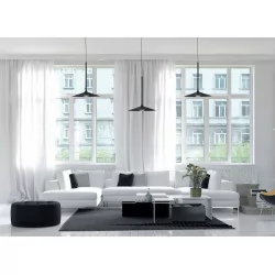 Maxlight HANA P0456, P0460 The Hana hanging lamp will charm many people with its simplicity and unpretentiousness. The fixture consists of a black lampshade resembling a wide, flat hat, made of metal and acrylic. The whole thing looks unique and natural, perfect as a complement to Scandinavian-style decor. The arrangement can be complemented with a matching wall lamp.