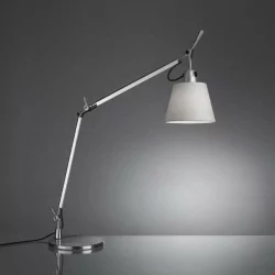 Artemide Tolomeo Basculante Table 0947010A, 0947020A modern, designer desk lamps by the Italian company Artemide with a parchment or satin gray shade. Made of polished aluminum with a balancing system. The light source is a bulb with an E27 socket with a maximum power of 46W (not included). Thanks to the possibility of adjusting the arm and the shade, the light can be directed to any place. The desk lamp is perfect for study and work, as well as in the bedroom, office, living room, reading room, etc.