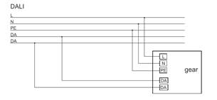 - System DALI – zaawansowany system umożliwiający sterowanie sześćdziesięciu czterech opraw, bądź szesnastu grup w trybie broadcast. Oprócz stałego zasilenia oprawy prądem przemiennym, system DALI wymaga również dwużyłowej linii sterującej. Jest zatem wymagana instalacja łącznie pięcioprzewodowa. Aktualnie na rynku dostępne są ściemniacze naścienne pracujące w systemie DALI wyglądające podobnie jak ściemniacze pracujące w systemie Phase Control. Należy jednak dobrać taki który będzie zasilał magistralę DALI.