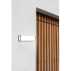 Lutec DOBLO to podłużny (35cm) kinkiet zewnętrzny LED na elewację. Wykonany z aluminium w kolorze szarym z mlecznym dyfuzorem. Źródłem światła jest wbudowany moduł LED o mocy 34W, emitując przy tym silny strumień 2200lm w barwie 4000K biała naturalna. Oprawa pasuje do nowoczesnych przestrzeni zewnętrznych i ogrodowych.