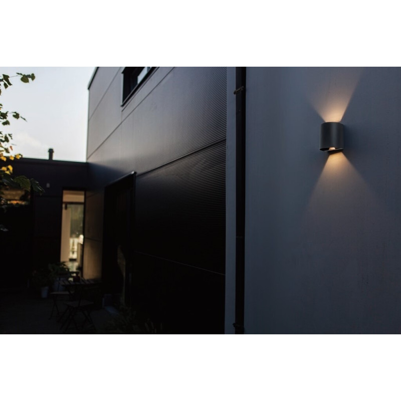 Kinkiet GEMINI BEAMS Up&Down w wersji zaokrąglonej oferuje regulowane wiązki światła. Dzięki wbudowanemu pierścieniowi z diafragmami możesz tworzyć cztery różne wzory świetlne na zewnętrznych ścianach. Lampa Lutec Gemini zawiera zintegrowane źródło światła LED w barwie białej ciepłej 3000K