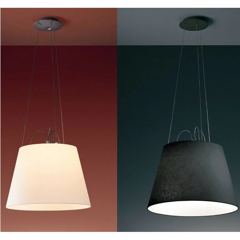 Artemide Tolomeo Mega suspension 0782010A, 0782030A największa z serii Tolomeo lampa wisząca. Podstawa wykonana z wtryskanego aluminium i tworzywa w kolorze aluminium lub czarny, zwieszana na 3 linkach. Lampa posiada gniazdo na żarówkę typu E27 (max 150W), należy dodatkowo dokupić abażur, którego nie ma w zestawie: czarna lub szara satyna bądź z pergaminu. Pasują abażury o średnicy 42cm lub 52cm.
