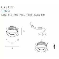 MAXLIGHT CYKLOP H0094, H0095 to pojedyncza, okrągła oprawa wpuszczana z ramką z możliwością wychyłu do 38° wyposażona w moduł LED o mocy 12W, generując przy tym 900lm przy barwie 3000K. Wykonana jest z wysokiej jakości aluminium wykończonego w kolorze białym lub czarnym. Elegancki i nowoczesny wygląd oraz uniwersalny kolor sprawiają, że ta oprawa sufitowa idealnie nadaje się do oświetlenia salonu, kuchni, sypialni, przedpokoju oraz korytarza.