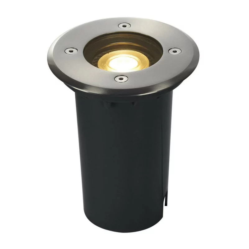 SLV SOLASTO 120 GU10 227680 to okrągła oprawa zewnętrzna dogruntowa z IP67. Przeznaczona do żarówek LED GU10 o max mocy 6W (brak w zestawie) Wykonana ze stali nierdzewnej 304, szkła i plastiku. Przeznaczona jest do montażu w podłożu w otworze o średnicy 10,5cm, wytrzymuje nacisk 600kg, co oznacza, że po oprawie można chodzić, ale nie można po niej jeździć. Nowoczesny wygląd oraz proste formy sprawiają, że ta oprawa gruntowa doskonale sprawdzi się jako oświetlenie ścieżek, chodników czy placów.